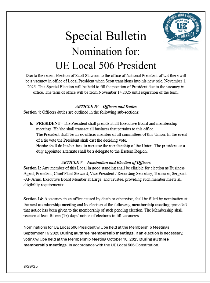 • 2024 UE Local 506 News and Bulletins